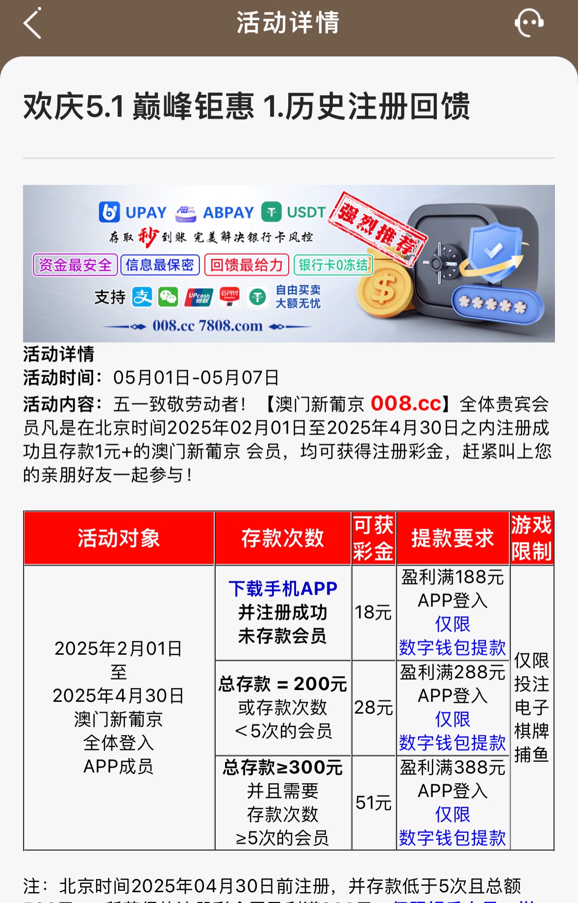 注册过的兄弟等5.1那天登入领彩金,没注册过的兄弟可以先注册下载APP登入等5.1那天上号也一样有彩金领,限电子棋牌捕鱼,回馈18要盈利满188才能提款