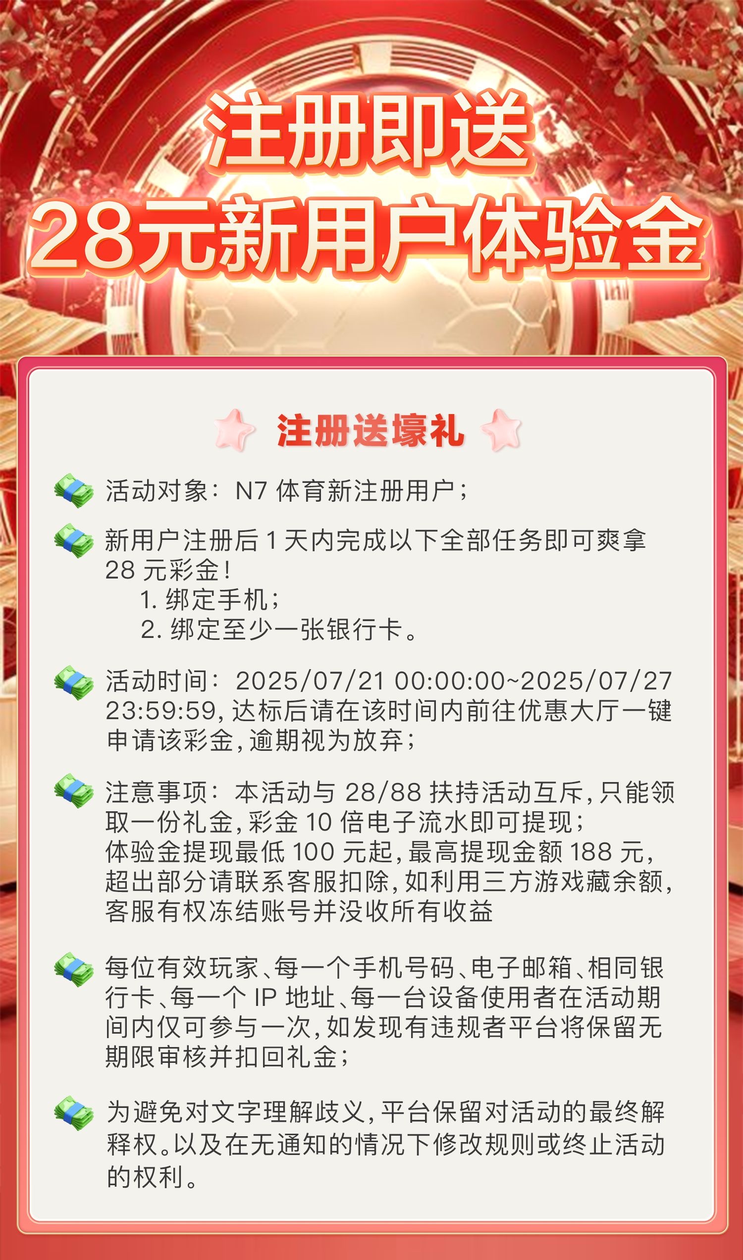 注册绑定手机号/银行卡,优惠大厅一键申请彩金,彩金10倍流水,最高低100/188提现,查IP