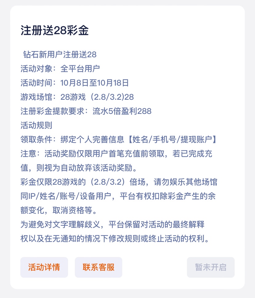 注册完善个人信息仅限娱乐28游戏2.8/3.2倍场,5倍流水,盈利满288取款